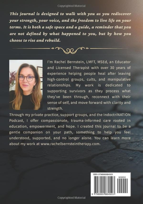 This guided healing journal offers a clear framework for recovery and self-discovery. It was written by Rachel Bernstein, LMFT, MSEd, a Licensed Marriage and Family Therapist with more than 30 years of experience helping survivors of narcissistic abuse, cults, spiritual abuse, toxic relationships, and high-demand groups. It draws on evidence-based counseling approaches, psychoeducation, and insights from Rachel’s internationally recognized IndoctriNATION Podcast, which has reached millions of listeners worldwide.